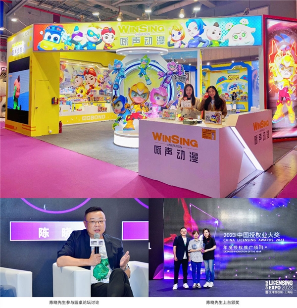 ? 6月28日至30日,詠聲動(dòng)漫攜旗下豬豬俠、百變校巴、詠玩潮·羊圓圓等IP空降2023全球授權(quán)展·上海站(LEC),兩大全新IP《喵能戰(zhàn)士》《反斗聯(lián)萌》首次亮相,吸引眾多企業(yè)現(xiàn)場(chǎng)咨詢。展會(huì)期間,詠聲動(dòng)漫副總裁、國際授權(quán)業(yè)協(xié)會(huì)大中華區(qū)顧問委員陳曉先生作為“2023年授權(quán)業(yè)論壇——圓桌對(duì)話”嘉賓,和多位行業(yè)大咖一起探討消費(fèi)復(fù)蘇的當(dāng)下,授權(quán)商與被授權(quán)商該如何應(yīng)對(duì)急速變換的市場(chǎng)趨勢(shì),現(xiàn)場(chǎng)分享實(shí)戰(zhàn)經(jīng)驗(yàn),共同促進(jìn)行業(yè)發(fā)展;此后,陳曉先生受邀出席 “2023中國授權(quán)業(yè)大獎(jiǎng)”頒獎(jiǎng)典禮,上臺(tái)為“年度授權(quán)推廣項(xiàng)目”頒發(fā)獎(jiǎng)項(xiàng)。