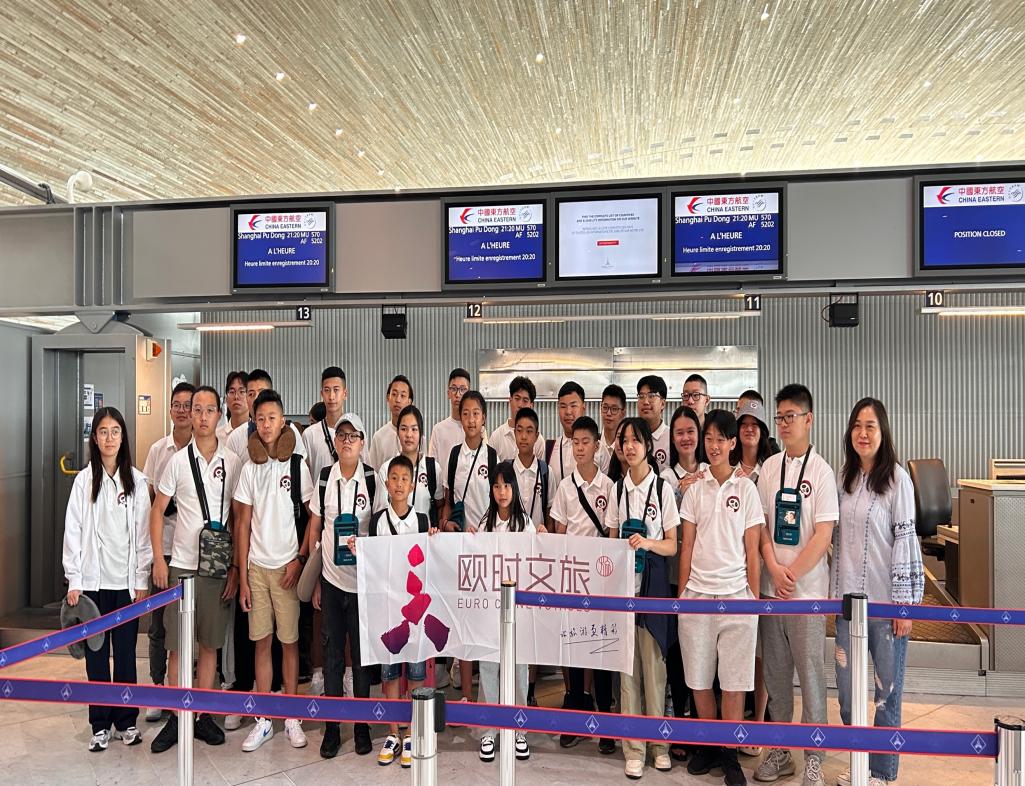 夏令營全體成員在巴黎戴高樂國際機(jī)場集結(jié)出發(fā)。