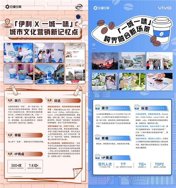 在垂類營銷層面,抖音生活服務(wù)打造《一城一味》IP,分別聯(lián)合vivo、伊利開展跨界營銷,借由上??Х任幕芗啊翱Х仁小钡某鞘形幕?通過線上種草、線下聚合客流打卡體驗(yàn)的方式,將品牌新品融入用戶高頻生活場景,有力強(qiáng)化上海本地消費(fèi)者對新品的認(rèn)知。