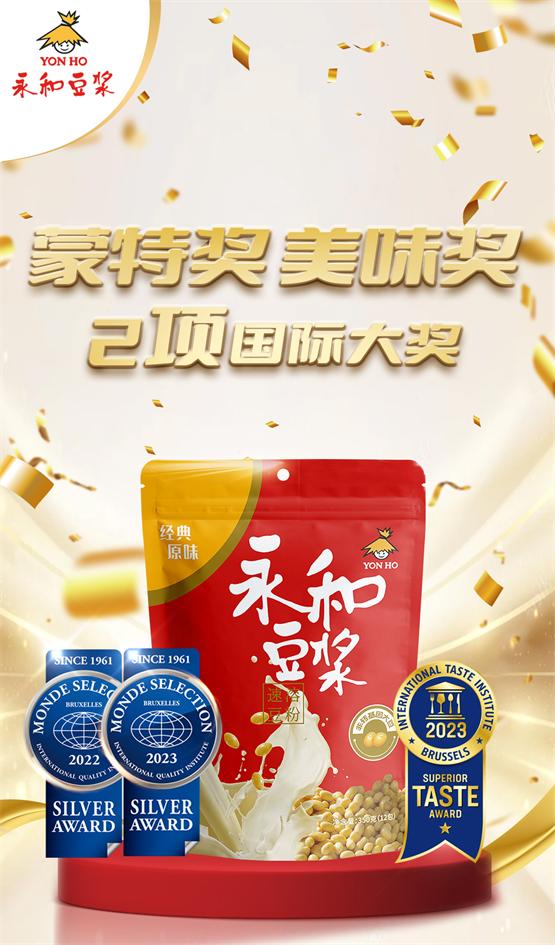 40年品質(zhì)經(jīng)營(yíng),永和食品多次榮獲全國(guó)產(chǎn)品和服務(wù)質(zhì)量誠(chéng)信示范企業(yè)、全國(guó)質(zhì)量檢驗(yàn)信得過(guò)產(chǎn)品等榮譽(yù)稱號(hào),2022-2023年,350g經(jīng)典原味豆?jié){粉更是連續(xù)2次榮獲世界食品品質(zhì)評(píng)鑒大會(huì)大獎(jiǎng),并與純豆?jié){粉一起斬獲ITI國(guó)際美味獎(jiǎng),品質(zhì)實(shí)力國(guó)際彰顯。
