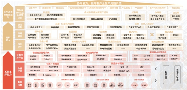 上圖為數(shù)字化經(jīng)營能力全景圖,最上層為全生命周期經(jīng)營規(guī)劃,即 AUM&MAU 雙軌經(jīng)營體系,包括不同階段的主要運(yùn)營目標(biāo),如新手期主要為用卡習(xí)慣養(yǎng)成、用戶價(jià)值快速識(shí)別、新戶首面后離店經(jīng)營繼承等。
