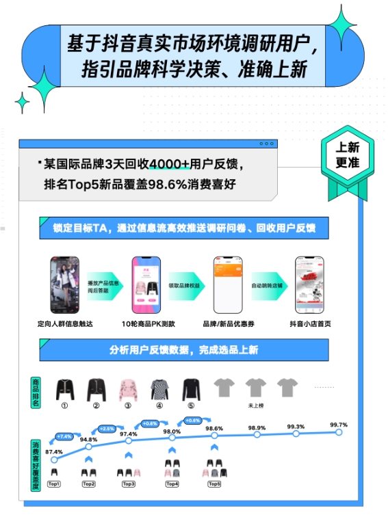 某國際服裝品牌在選品上新時使用巨量云圖“新品實驗室”的測品能力,僅用時三天就回收了超過4000份目標用戶反饋,選出的貨品,也成為后續(xù)品牌直播間銷量冠軍,為店鋪GMV的主力貢獻商品。獲得這樣的上新成績是因為巨量云圖在測品的每個細節(jié)都試圖降低誤差,從而最大程度還原消費者真實意愿。