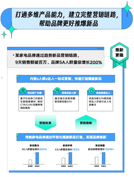 最近,巨量云圖發(fā)布了「新品C位出道指南」,提供 看機會、測產(chǎn)品和推爆款 全鏈路能力,讓品牌能夠更快速地洞察機遇、更準確地測試產(chǎn)品以及更穩(wěn)健地推動新品打爆,核心目標就是借用營銷科學(xué)手段幫助商家真正實現(xiàn) 快、準、穩(wěn) 地上新。