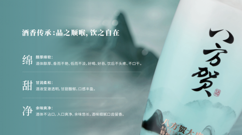 「八方賀特級(jí)清香型白酒」,傳承中華古法釀造工藝彰顯酒體釀造智慧。采用清蒸二次清工藝、地缸發(fā)酵、古法蒸餾的傳統(tǒng)清蒸發(fā)酵法釀造,盡顯清香白酒的醇厚綿軟、甘潤柔和;三款白酒宛如歷史的古舊卷軸,在感官的呼喚下,展開了一幅醇香的畫卷。