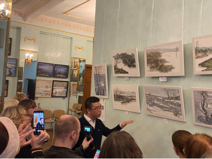 開幕當天,畫家劉子輿受邀走進俄羅斯國家科學院“大師課堂”,教授俄羅斯學員創(chuàng)作中國水墨畫。學員不少是俄羅斯知名的專業(yè)油畫家。劉子輿從畫面構(gòu)圖、運筆、調(diào)墨、調(diào)色等方面進行深入講解,現(xiàn)場示范中國繪畫技巧,墨色在宣紙上產(chǎn)生濃淡變化,學員們很驚喜,非常感謝劉子輿帶領(lǐng)他們體驗了東方藝術(shù)之美。
