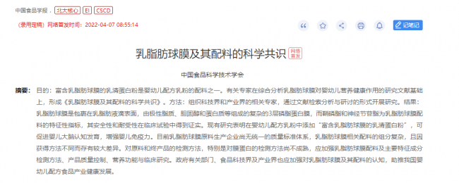 4月7日,《中國食品學(xué)報》刊發(fā)中國食品學(xué)界剛剛?cè)〉玫囊粋€突破性科學(xué)共識成果——中國工程院院士、中國農(nóng)業(yè)大學(xué)營養(yǎng)與健康研究院院長任發(fā)政等近20位中國食品科學(xué)技術(shù)學(xué)會權(quán)威專家形成了國內(nèi)首個《乳脂肪球膜及其配料的科學(xué)共識》(以下簡稱“乳脂肪球膜科學(xué)共識”),共識明確指出,嬰幼兒配方乳粉添加“富含乳脂肪球膜的乳清蛋白粉”后可促進嬰兒大腦認知發(fā)育、增強嬰兒免疫力。
