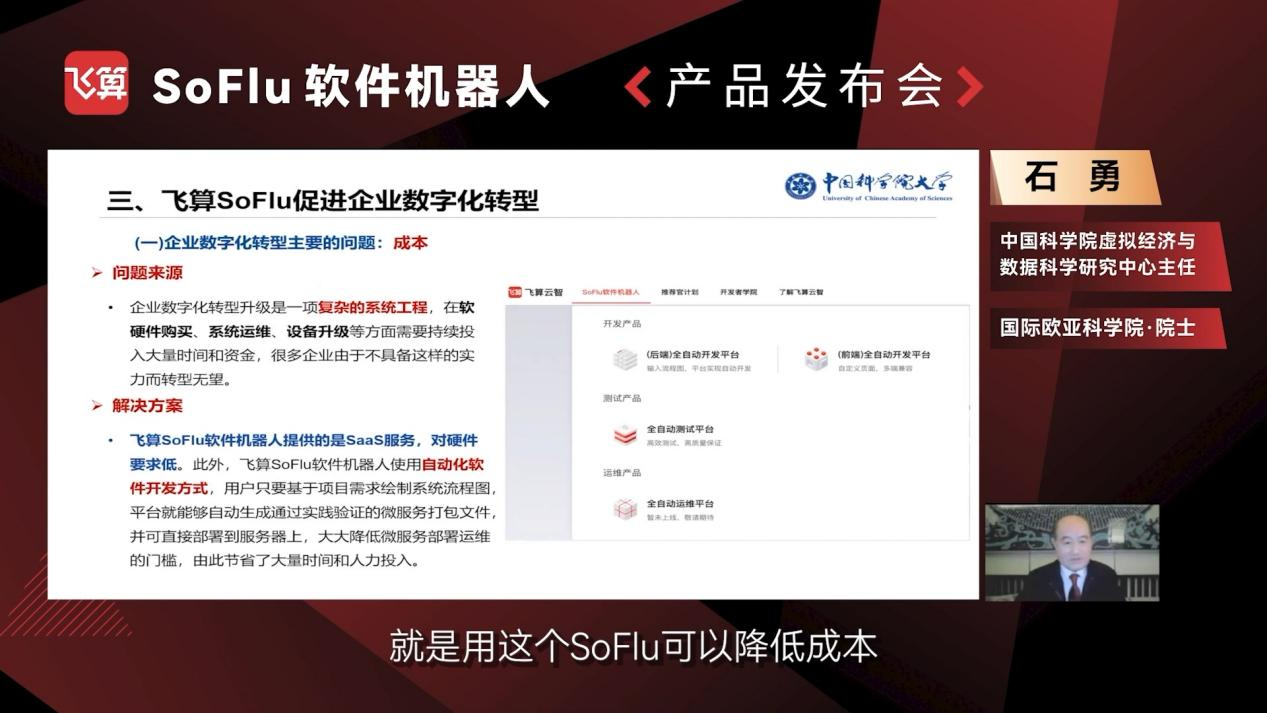 “全自動開發(fā)無疑是大勢所趨。軟件行業(yè)高度依賴人力,這導(dǎo)致軟件開發(fā)效率低、質(zhì)量差,只有解決以上問題,企業(yè)才能順利推進(jìn)數(shù)字化轉(zhuǎn)型?!憋w算云智總裁、SoFlu軟件機(jī)器人的總設(shè)計師陳定瑋在發(fā)布會上表示。