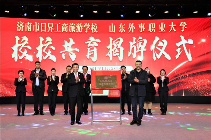 濟(jì)南市日昇工商旅游學(xué)校黨支部書記楊楠與山東外事職業(yè)大學(xué)副校長孫彤宇共同為山東外事職業(yè)大學(xué)“合作共建單位”揭牌。
