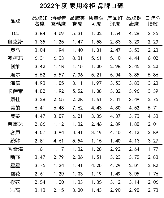 2023年5月10日是第七個中國品牌日,由工業(yè)和信息化部工業(yè)文化發(fā)展中心、中華商標協(xié)會、中國醫(yī)藥新聞信息協(xié)會、國統(tǒng)大數(shù)據(jù)研究實驗室等機構聯(lián)合推動的品牌口碑評價工程今日在京發(fā)布2022年度家用冷柜品牌口碑報告(以下簡稱《報告》)。