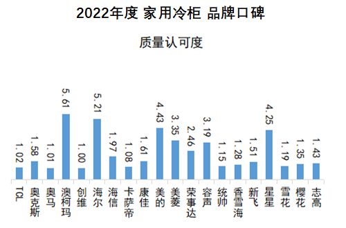 質量認可度方面,澳柯瑪、海爾、美的位居前三。澳柯瑪、海爾、美的、星星、美菱、容聲、榮事達、海信、康佳、奧克斯在近兩期中均位居前十。