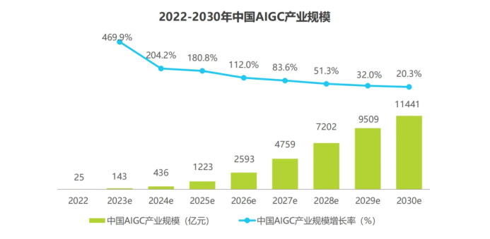 報(bào)告指出,2023年中國AIGC產(chǎn)業(yè)規(guī)模約為143億元,隨后進(jìn)入大模型培育期,持續(xù)打造與完善底層算力基建、大模型商店平臺等新型基礎(chǔ)設(shè)施,以此孕育成熟技術(shù)與產(chǎn)品形態(tài)并將其對外輸出。到2030年中國AIGC產(chǎn)業(yè)規(guī)模有望突破萬億元,達(dá)到11441億元。