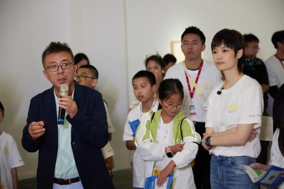 ▲李宇春、劉小東、喻紅向參加夏令營活動(dòng)的師生發(fā)放藝術(shù)夢想包