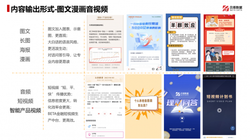 為此,貝塔數(shù)據(jù)團隊搭建了“BETA內(nèi)容工廠”,并與內(nèi)外部合作伙伴合作,以確保金融機構(gòu)能夠獲得豐富的內(nèi)容資源。此外,他們還設(shè)計了12道工序進行內(nèi)容清洗和分類,以確保內(nèi)容的合規(guī)性和質(zhì)量。數(shù)千個內(nèi)容標簽和圖譜式的內(nèi)容管理可讓內(nèi)容互相關(guān)聯(lián),并基于算法+中臺的方法來提高內(nèi)容產(chǎn)出效率。最后,采用千人千面的方式進行產(chǎn)出,以進一步滿足投教的個性化需求。這些方法可以有效地保證金融機構(gòu)提供高質(zhì)量、大量的投教內(nèi)容。