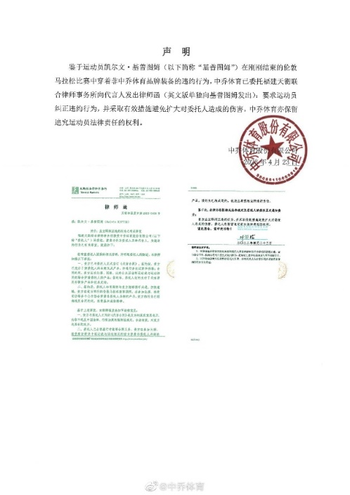 賽后,中喬體育發(fā)出官方聲明,要求運(yùn)動員糾正違約行為并寄出律師函。據(jù)悉,Kelvin Kiptum (凱爾文·基普圖姆)于今年3月8日正式成為中喬體育品牌代言人,中喬體育通過官方渠道釋放了這一訊息。在賽前一系列訓(xùn)練,Kelvin Kiptum (凱爾文·基普圖姆)也使用中喬體育的運(yùn)動產(chǎn)品,但在倫敦馬拉松正式比賽上卻公然違約,這一行為在網(wǎng)絡(luò)上引發(fā)熱議。在社交媒體上,眾多體育愛好者表示憤慨,并支持中喬體育合理維權(quán),事件的后續(xù)發(fā)展受到體育圈層的廣泛關(guān)注。